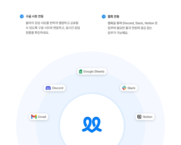 - 디스코드나 슬랙스, 노션 등 업무에 필요한 노코딩 툴과 연동이 가능해요!