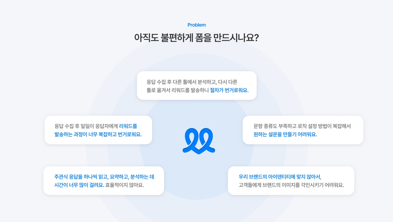그렇지만 어디 일반 사용자만 있을까요? 기업 급의 기획, 마케팅, 분석 담당자들의 입장으로 들어가보면 사정이 달라지지요. 응답 수집 후에 다른 툴에서 분석해야 되고, 다시 다른 툴에서 리워드를 발송하는 과정이 너무 복잡하고 번거로워질 수 있어요.